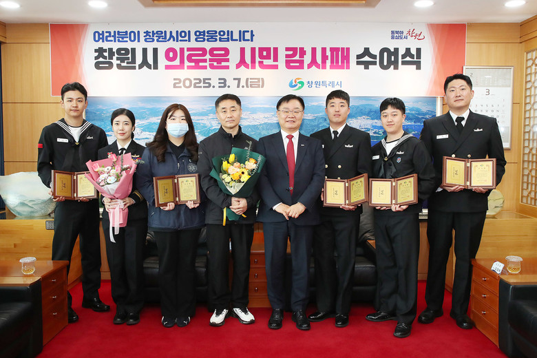 [창원시 세계타임즈=최성룡 기자] 창원특례시(시장 홍남표)는 7일 위급한 상황에서 용기있게 시민의 생명을 구하고 큰 피해를 막은 의인 6명에게 창원시민의 마음을 담아 감사패를 전달했다.