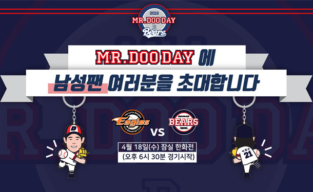 [세계타임즈 김인수 기자] 두산베어스(社長 全豐)가 18일(수) 잠실에서 열리는 한화와의 홈경기에서 ‘미스터두데이(Mr.Doo Day)’ 이벤트를 개최한다.