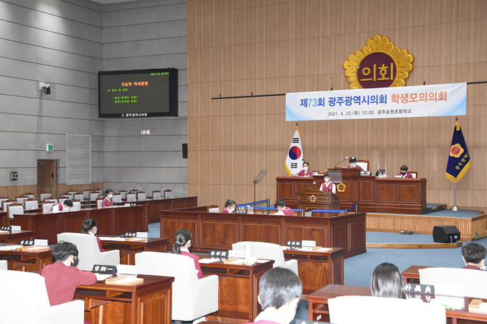 [광주=세계타임즈 손권일 기자] 광주광역시의회(의장 김용집)는 4월 22일(목) 10시에 시의회 본회의장에서 광주송원초등학교 학생들을 대상으로 ‘광주광역시의회 제73회 학생 모의의회’를 개최했다.