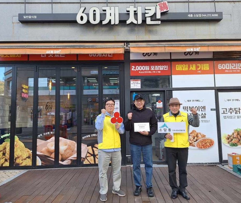 ‘60계치킨 세종소담점’은 매월 관내 취약계층 5가구에 치킨 1마리씩을을, ‘이디야커피 소담동점’은 매달 관내 취약계층 5가구에 음료와 빵 등을 제공하며 나눔문화 확산에 기여하고 있다.