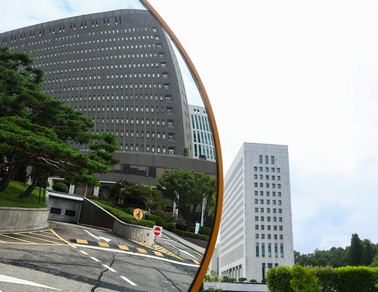 서울중앙지방검찰청이 전날 김건희 여사를 정부 보안청사에서 비공개 조사한 사실을 대검찰청에 사전 보고하지 않은 것으로 드러난 21일 오후 서울 서초구 대검찰청과 거울에 비친 서울중앙지방검찰청의 모습.[사진=연합뉴스]