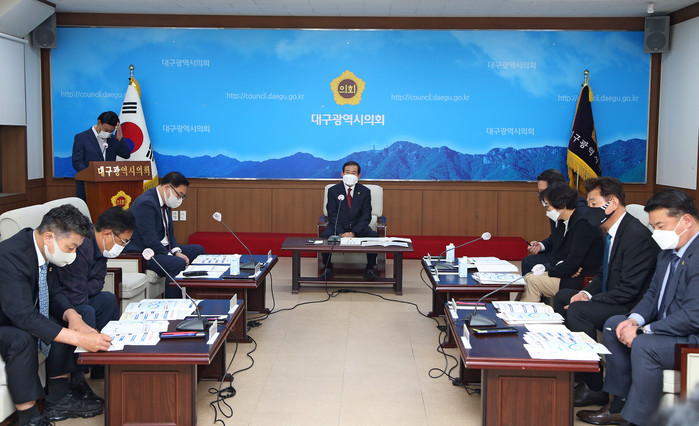 [대구=세계타임즈 한성국 기자] 대구시의회는 11월 8일(월) 11시 시의회 2층 회의실에서 ‘확대의장단 회의’를 열고 2022년 예산안 심사를 대비하여 대구시 및 대구시교육청 주요 예산편성 현황 및 신규 사업에 대한 보고를 받고 질의응답 시간을 가졌다.