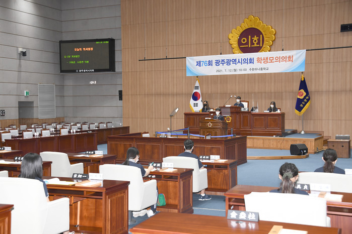 [광주=세계타임즈 손권일 기자] 광주광역시의회(의장 김용집)는 7월 12일(월) 오전 10시에 시의회 본회의장에서 수완하나중학교 학생들을 대상으로 ‘광주광역시의회 제76회 학생 모의의회’를 개최했다.