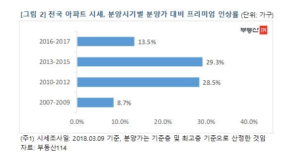 부동산114에 따르면 분양가 자율화 시기인 2007년~2009년 분양된 단지의 현재 시세는 분양가 대비 전국 평균 8.7% 오르는데 그쳤다. 주변 시세보다 높은 분양가로 분양하면서 이 시기 분양 단지 중에서 17만 가구의 시세는 여전히 분양가를 회복하지 못하고 있다. 반면 △2010년~2012년 분양단지는 28.5% △2013년~2015년 분양단지는 29.3% 각각 분양가 대비 프리미엄이 올랐다.