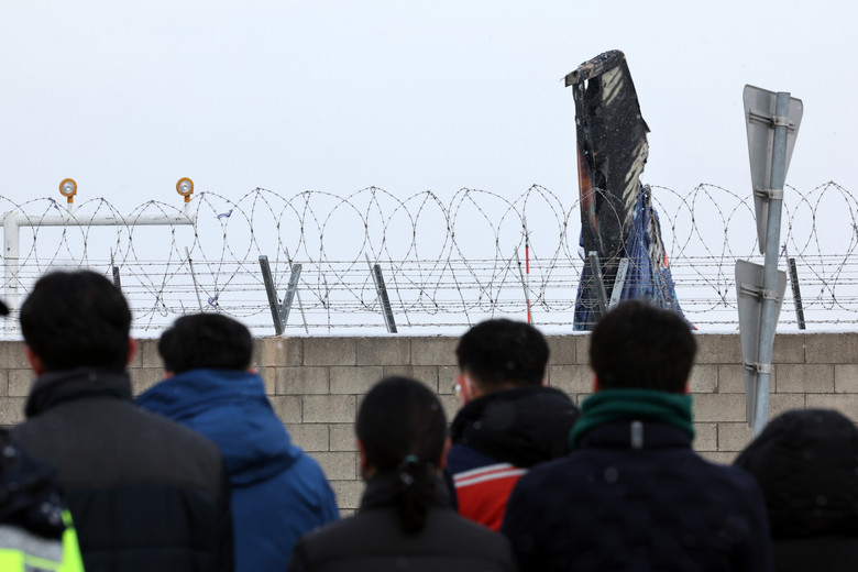 제주항공 참사 2주째인 11일 오전 무안국제공항에서 유가족들이 사고 현장을 찾아 기체를 바라보고 있다. 2025.1.11