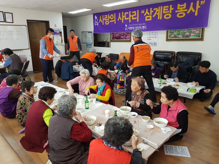 이날 삼계탕 봉사는 ㈜동건운수의 후원으로 유희자 이사 신상일 이사, 김호현 이사 등 사랑의 사다리 밴드 회원 20명과 동건운수의 이선엽 대표, 지상욱 부장 등 한우리 봉사단 15명이 목상동 어르신들께 삼계탕과 닭죽 봉사를 하였다.