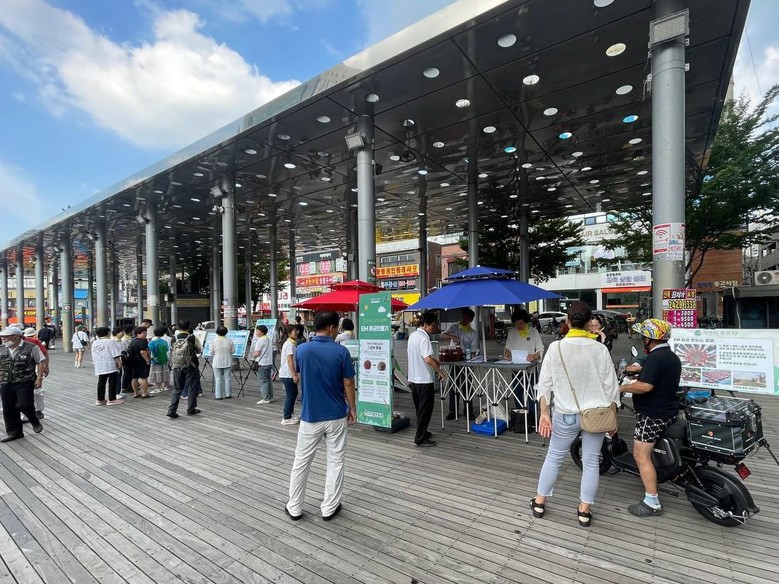 | ▲지난 31일 부천 북부역 광장에서 깨끗한 ‘물’ 캠페인을 진행한 가운데 시민들이 일회용품 분해 기간 도슨트를 듣고 있다. [사진 제공 = 신천지자원봉사단 부천지부] |