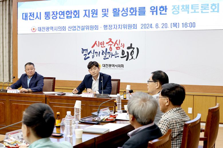 [대전 세계타임즈=이채봉 기자] 대전시의회 송대윤 의원(더불어민주당, 유성구 2)과 이용기 의원(국민의힘, 대덕구 3)이 6월 20일(목) 시의회 3층 소통실에서 '대전시 통장연합회 지원 및 활성화를 위한 정책토론회'를 개최했다.