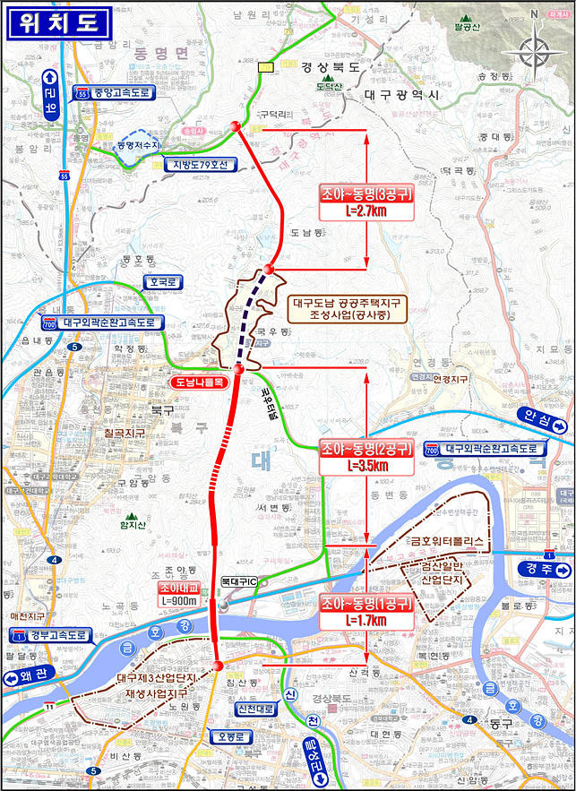 ※ 1공구 : 침산동~조야동(1.7km) / 2공구 : 조야동~도남지구(3.5km) / 3공구 : 도남지구~동명면(2.7km)