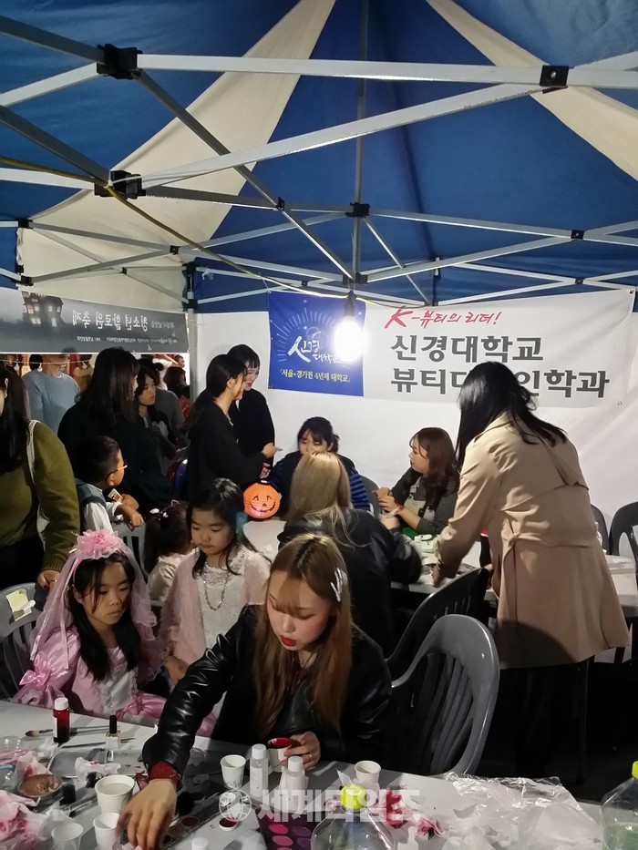 [화성시=세계타임즈 이영진 기자] 지역사회 공헌대학, 학생 중심대학인 신경대학교의 뷰티디자인학과는 10월 28일 17시부터 시작 된 남양 할로윈 축제에서 지역 청소년들을 위한 할로윈분장 자원봉사에 참여하여 행사에 어울리는 특색의 할로윈 분장을 쉴 새 없이 그려내어 최고의 인기를 누렸다.