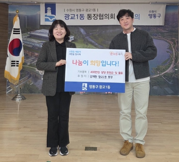 한편, 이번에 기탁된 성금과 후원 물품은 광교1동 관내 저소득 가정과 복지 사각지대에 놓인 이웃들에게 전달돼 생활 안정과 정서적 지원에 활용될 예정이다.