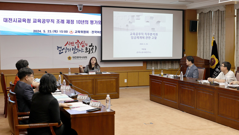 [대전 세계타임즈=이채봉 기자] 대전시의회는 김민숙 의원(더불어민주당, 비례대표) 주재로 23일 시의회 소통실에서 ‘대전시교육청 교육공무직 조례 제정 10년의 평가와 발전 방안 모색 정책토론회’를 개최했다.