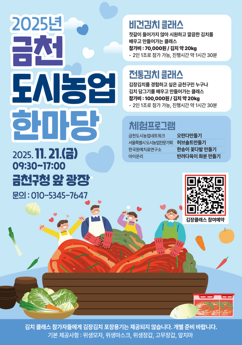 유성훈 금천구청장은 “물가가 오르고 경제가 어려워졌지만 금천 도시농업 한마당을 통해 이웃과 함께 김장을 담그며 따뜻한 온기를 느끼길 바란다”라며 “나눔과 공동체의 소중함을 느낄 수 있는 시간이 되도록 적극 지원하겠다”라고 전했다.