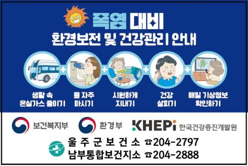 울주군보건소 관계자는 “올해는 예년보다 폭염 일수가 늘어날 것으로 예상되는 만큼 취약계층 방문건강관리를 더욱 강화해 폭염 피해를 막고, 건강한 여름을 날 수 있도록 최선을 다하겠다”고 밝혔다.