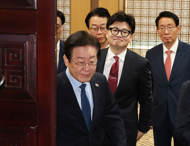 [세계타임즈 = 신상철 기자] 국민의힘 한동훈 대표와 더불어민주당 이재명 대표(왼쪽)가 1일 오후 국회에서 채상병 특검법, 금융투자소득세 폐지, 전 국민 25만원 지원법 등을 논의하는 여야 대표 회담을 마친 뒤 나오고 있다. 2024.9.1
