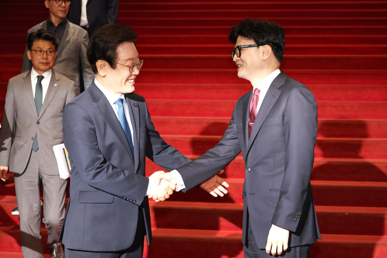 [세계타임즈 = 신상철 기자] 국민의힘 한동훈 대표와 더불어민주당 이재명 대표(왼쪽)가 1일 오후 국회에서 채상병 특검법, 금융투자소득세 폐지, 전 국민 25만원 지원법 등을 논의하는 여야 대표 회담을 마친 뒤 인사하고 있다. 2024.9.1