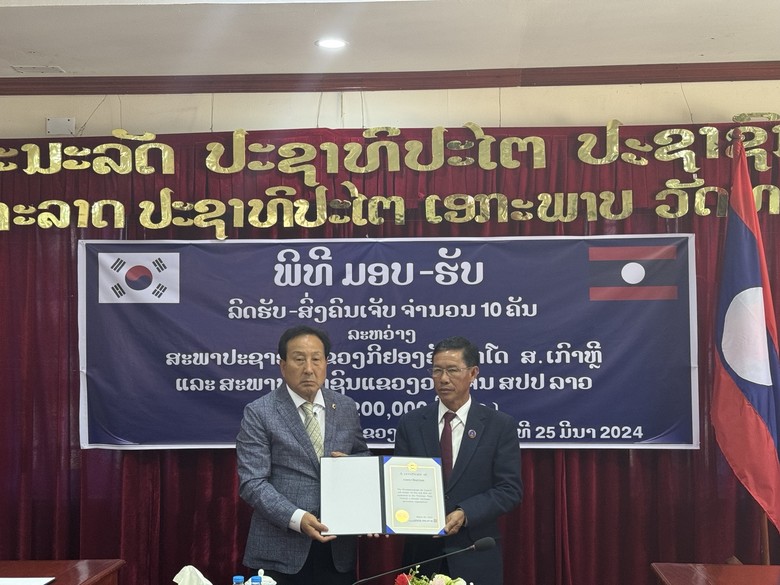 경남도의회(의장 김진부)가 25일, 우호교류 협약단체인 라오스 비엔티엔주의회에 소방 특수구급차량 10대와 특수방화복 60착 등 소방용품을 기증하고 기증식을 개최했다. 2대는 인근 바께오주에 전달됐다.