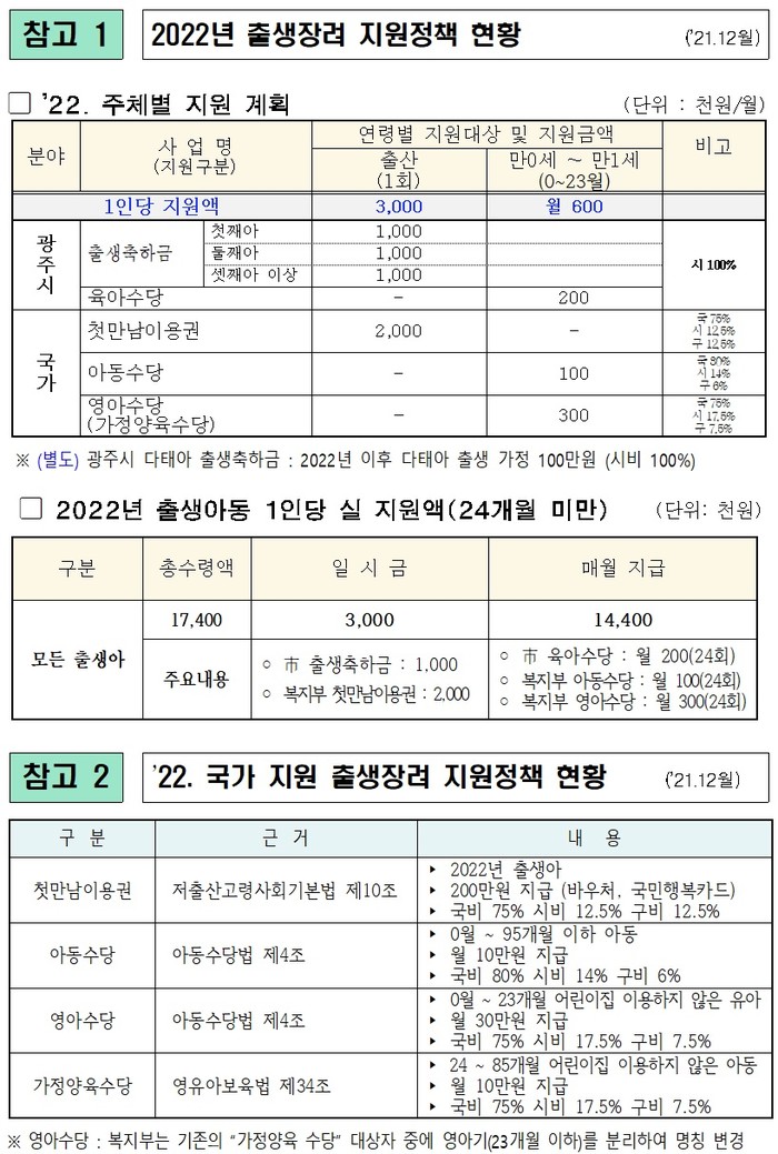 2022년 광주에서 출생하는 아동은 2년 동안 ▲광주시 출생축하금 100만원 ▲정부가 전국에서 동일하게 지급하는 첫만남이용권 200만원 바우처 ▲광주시 육아수당 24개월간 월 20만원 ▲정부 아동수당 24개월간 월 10만원 ▲정부 영아수당 24개월간 월 30만원 ▲(추가) 광주시 다태아 출생축하금 100만원 등을 지원받게 된다.