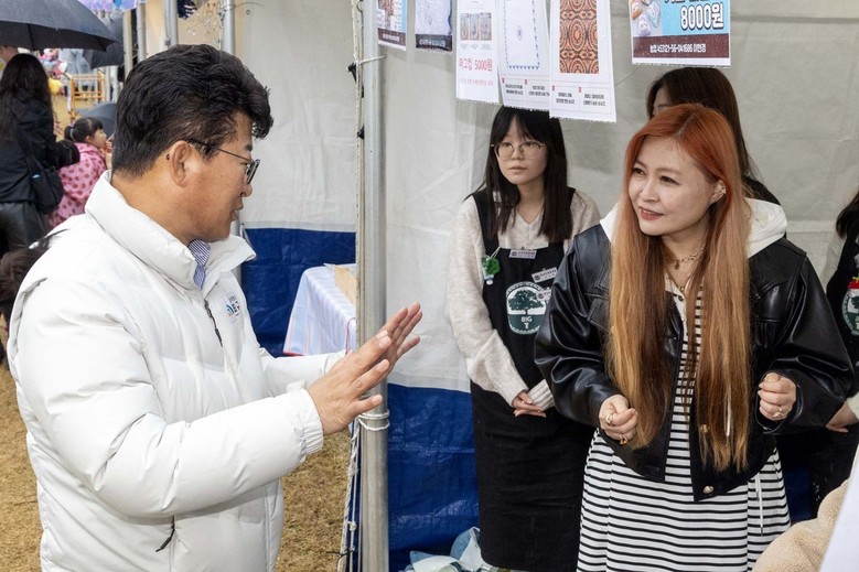 | ▲ 최충규 대덕구청장(사진 왼쪽)이 ‘2025 대덕물빛 축제’ 플리마켓 운영자를 격려하고 있다. |