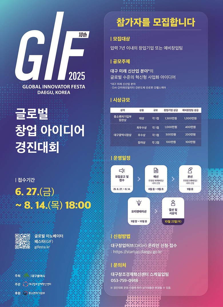 ▸ 최종 시상 10팀(창업기업 5팀, 예비창업팀 5팀), 총상금 5,000만 원 [세계타임즈=대구 한윤석 기자] 대구광역시는 혁신 창업 아이디어를 보유한 유망 창업기업 및 예비창업자를 발굴하기 위한 2025 글로벌 이노베이터 페스타(GIF 2025) ‘글로벌 창업 아이디어 경진대회’ 참가자를 6월 27일(금)부터 8월 14일(목)까지 모집한다.