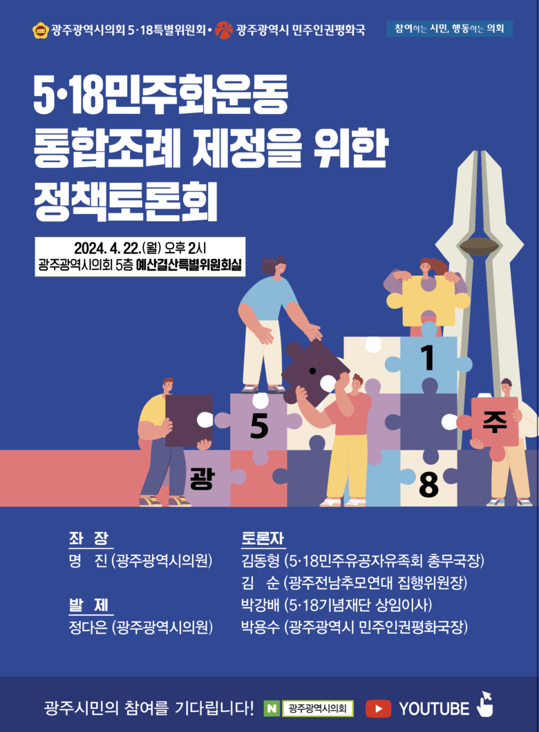 - 5·18 헌법전문 수록 염원, 5·18 콘트롤타워 구성, 진조위 후속조치 등 담아 [광주 세계타임즈=손권일 기자] 광주광역시의회 5·18특별위원회(정다은 위원장)는 오는 22일(월) 오후 2시, ‘5·18민주화운동 통합조례 제정을 위한 정책토론회’를 개최한다.