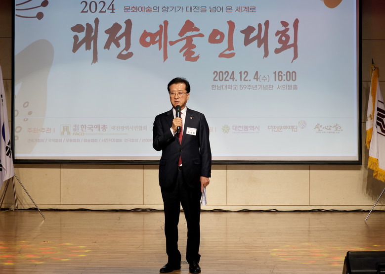 [대전 세계타임즈=이채봉 기자] 대전시의회 조원휘 의장은 4일 한남대 서의필홀에서 개최된 ‘2024년 대전예술인대회’를 찾아 “열정적으로 활동하는 예술인들과 후원을 아끼지 않는 기업인들 덕분에 대전의 예술 산업이 더욱 아름답게 빛나고 있다”며 자리를 함께한 지역 예술인과 기업인에게 감사의 마음을 전했다.