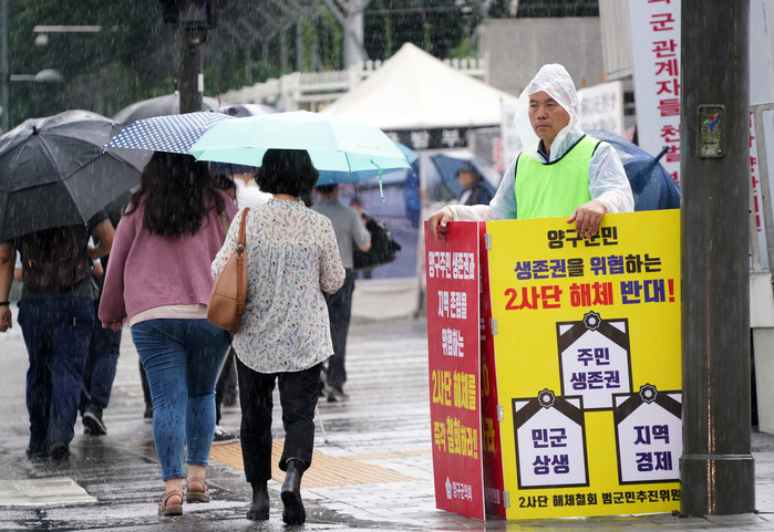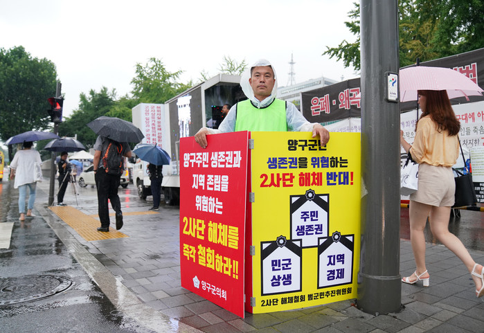[양구군=세계타임즈 김민석 기자] 박귀남부의장이 31일 서울 용산 국방부 정문에서 2사단 해체반대 1인시위를 하고 있다.
