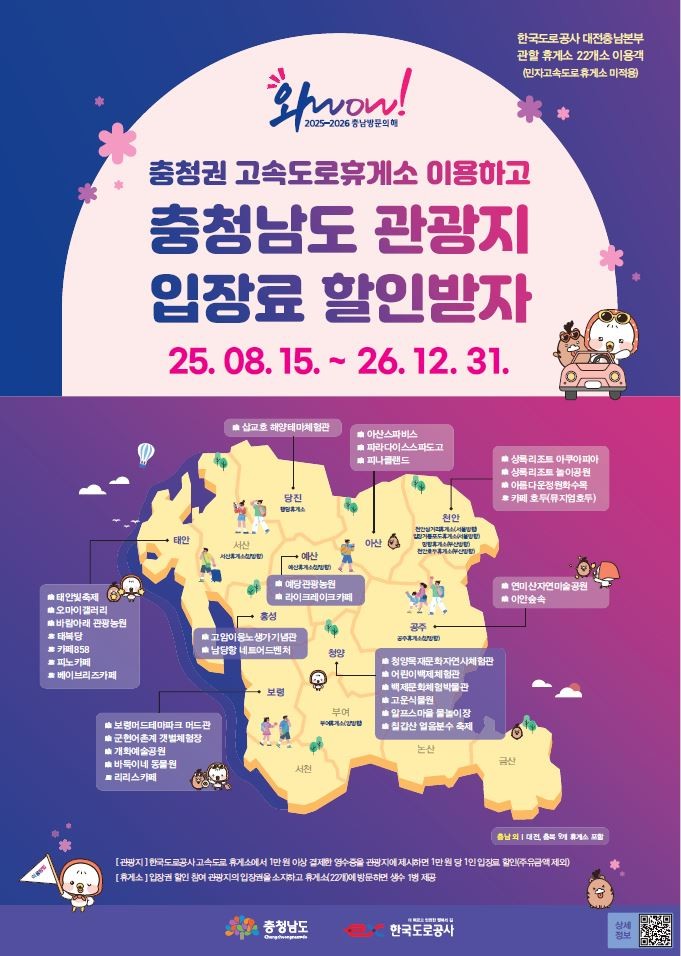 이는 충남 방문의 해 종료 시까지 1년 5개월여간 진행하며, 한국도로공사 대전충남본부 관할 고속도로 휴게소 22개소와 도내 9개 시군 31개 제휴 관광지를 대상으로 한다.