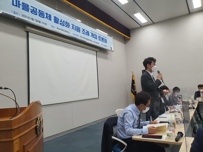 시의회 행정문화위원회(위원장 김태훈)와 (사)시민정책공방는 공동으로 지난 7일 오후 3시 부산시의회 중회의실에서 ‘마을공동체 활성화 지원 조례 개정 토론회’를 개최했다.