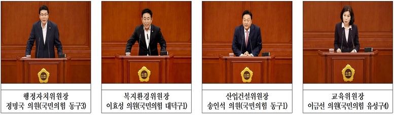 [대전 세계타임즈=이채봉 기자] 대전시의회가 15일 제280회 임시회 제4차 본회의를 열어 상임위원장단 선거를 실시한 가운데, 행정자치위원장에 정명국 의원(국민의힘 동구3), 복지환경위원장에 이효성 의원(국민의힘 대덕구1), 산업건설위원장에 송인석 의원(국민의힘 동구1), 교육위원장에 이금선 의원(국민의힘 유성구4)이 각각 당선됐다.