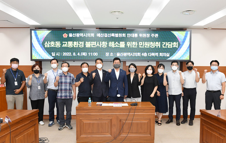 [울산 세계타임즈=이호근 기자] 안대룡 울산광역시의회 예산결산특별위원장은 8월 4일 오전 11시, 시의회 4층 다목적회의실에서 삼호동 지역주민들과 관계 공무원이 참석한 가운데 ‘삼호동 일원 교통환경 및 주변 환경 개선 등 지역 현안을 해결하기 위한 주민의견 청취 간담회’를 가졌다.