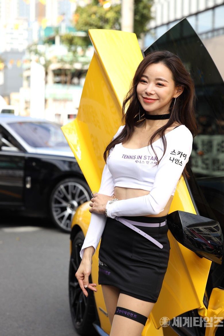 [슈퍼카에서 레이싱모델 민서희가 포즈를 하고 있다. 사진:방춘재]