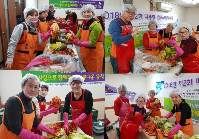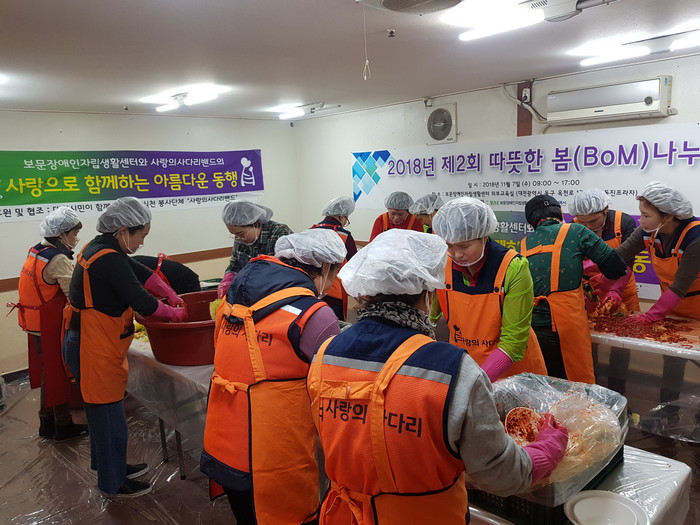 [세계타임즈 이장성 기자] 7천명 SNS 대전시 봉사단체 사랑의 사다리 밴드(리더 이정제)는 7일 오전9시, 동구 판암동에 위치한 보문장애인자립생활센터(센터장 신인수)에서 김장 300포기 봉사로 우리 사회의 따뜻한 사랑을 실천하였다.