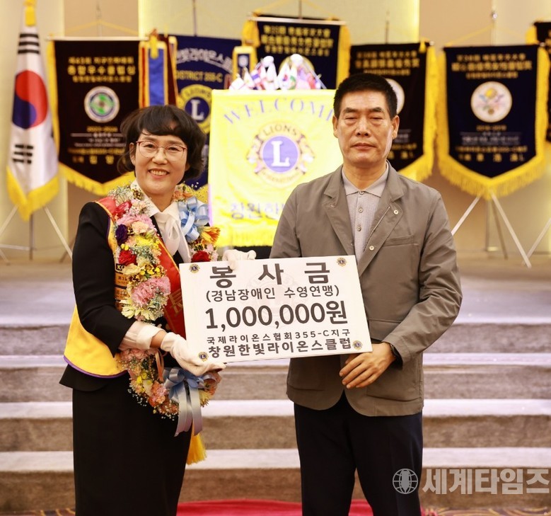 [세계타임즈 = 이판석 기자] 국제라이온스 355-C지구 창원한빛라이온스클럽에서는 2017년도 유금이 회장 취임 이후부터 2023-24년 제25대 김은숙 회장, 그리고 2024-25년 올해 취임하는 제26대 김영자 회장까지 8년에 걸쳐서 경상남도장애인수영연맹 (회장:강동환 )에 지속적으로 후원했다.