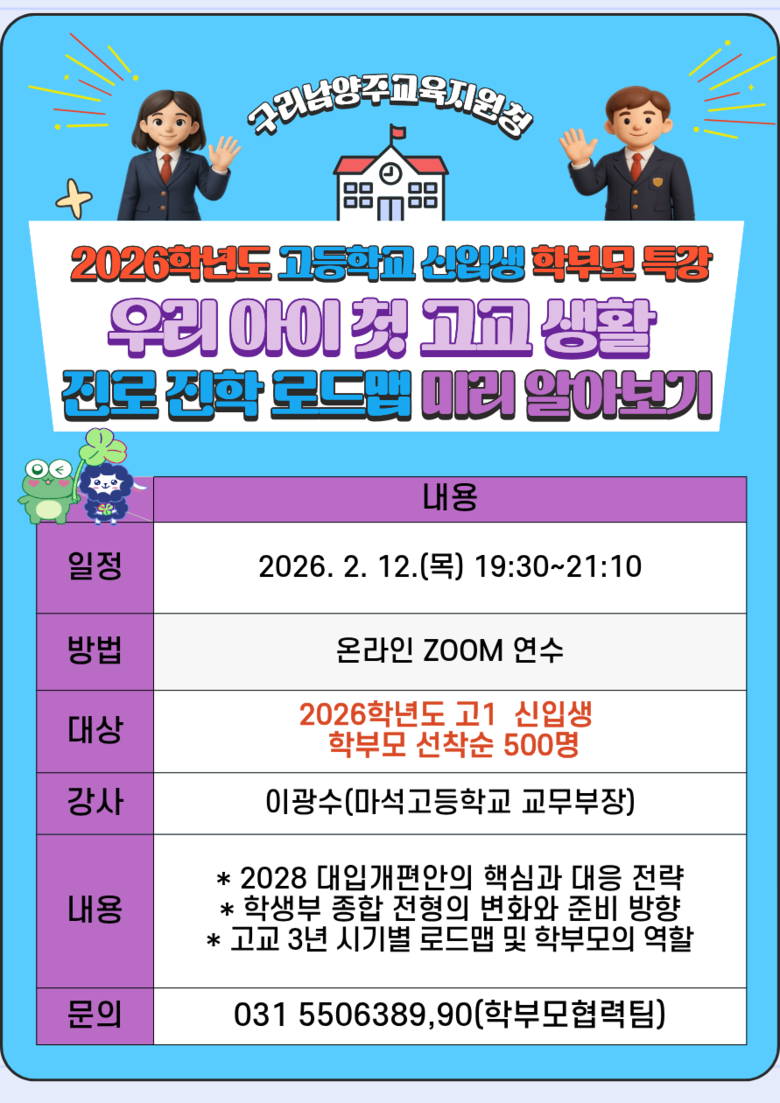 참여 학부모는 “퇴근 후 집에서 바로 참여할 수 있어 현실적으로 큰 도움이 됐다”며 만족감을 나타냈으며, 또 다른 학부모는 “중·고등학교 정보를 한 번에 정리해 들을 수 있어 자녀 입학 준비에 큰 자신감을 얻었다”고 말했다. 서은경 교육장은 “학부모가 학교를 이해하고 자녀의 성장을 함께 지원할 수 있도록 접근성 높은 교육을 계속 확대하겠다”고 밝혔다.