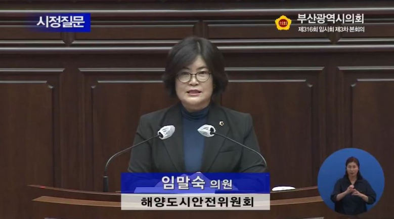 [부산 세계타임즈=이용우 기자] 부산광역시의회 해양도시안전위원회 임말숙 의원(국민의힘, 해운대구2)은 14일(목) 제316회 임시회 시정질문을 통해, 부산시 집단에너지 공급시설 운영과 관리에 대한 재원확보 방안 마련과 주민들과의 적극적인 소통을 촉구하였다.