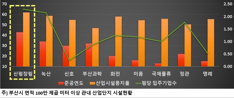 ◈ 신평·장림 산단 오래되고, 산업용지 비율 높고, 면적당 입주기업 수도 가장 열악