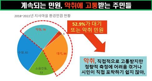 송 의원은 자연환경뿐만 아니라 시민들의 정주여건도 큰 문제가 있다는 점을 지적하며, “4년 남짓한 기간 동안 이 마을에서만 300건이 넘는 환경 민원이 발생했다”면서, “그럼에도 관리단속이 잘되지 않아 수십건의 악취민원을 발생시킨 사업장도 버젓이 운영되고 있다”고 환경관리 부실을 강력히 규탄했다. 그러면서, “부산시가 환경관리를 위한 엄정한 행정력이나 제도적 장치에는 인색하고, 시민의 건강에 가해자가 될지도 모르는 신규 산업단지와 공장 조성에만 매몰되어 있다”고 꼬집었다.