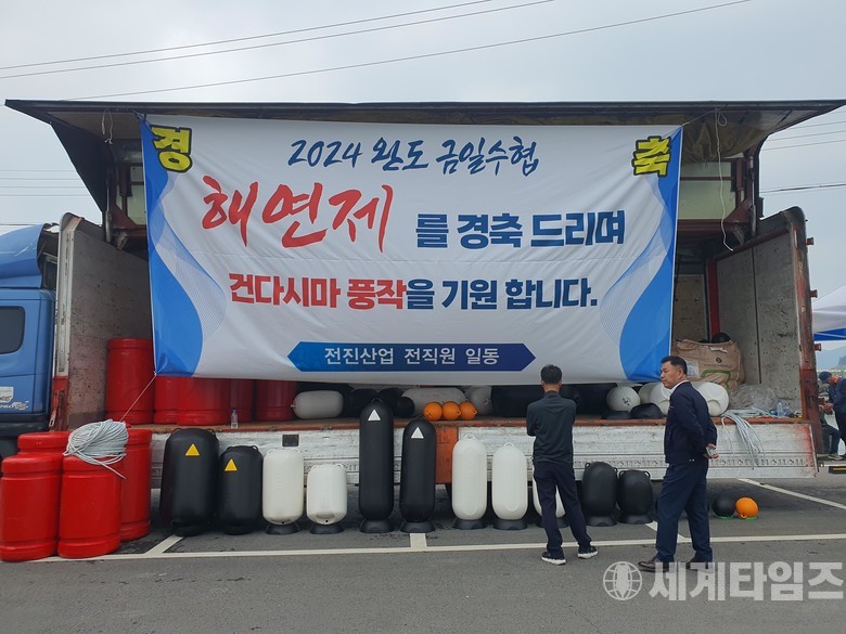 | ▲ ㈜전진산업 완도금일수협 ’해연제‘ 행사 참여해 어민들에게 친환경 부표의 우수성을 알리고 있다. © 사진=최신뉴스 신정문기자 |