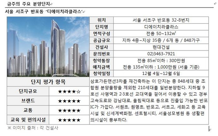 [세계타임즈 심귀영 기자]부동산114(www.r114.com)에 따르면 12월 첫째 주에는 전국 5,798가구가 분양한다. 수도권에서는 서울 서초구 반포동에 ‘디에이치라클라스’가 분양에 나선다.