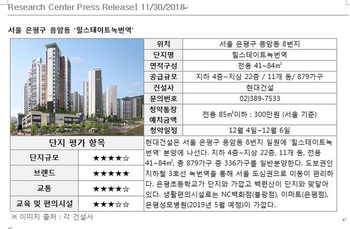 ‘삼호가든맨션3차’를 재건축하는 단지로 3.3㎡당 4,687만원의 평균 분양가로 공급된다. 11월 분양한 서초동 ‘래미안리더스원’ 평균 분양가 4,489만원보다 약 4% 오른 가격이지만 주변 시세보다 저렴하다는 평을 받고 있다. 그 외 서울 은평구 응암동 ‘힐스테이트녹번역’, 경기 부천시 송내동 ‘래미안어반비스타’가 수도권 역세권 입지를 갖춰 눈길을 끌 전망이다.