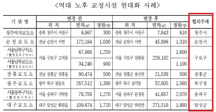 실제 역대 노후 교정시설 현대화 사례를 살펴보면, 청주여자교도소(청주시), 순천교도소(순천시), 서울남부구치소 및 교도소(서울 구로구), 장흥교도소(장흥군), 광주교도소(광주 북구), 서울동부구치소(서울 송파구), 대구교도소(대구 달성군) 등 모두 기초지자체가 협의 주체가 되었다.