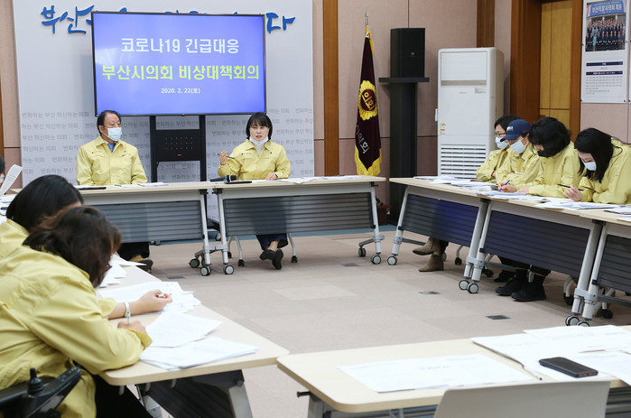 부산시의회는 22일(토) 오후 1시, 시의회 이음홀에서 박인영 의장 주재로 의장단, 각 상임위원장, 시의회 코로나19 TF 소속 의원 등이 참석한 가운데 ‘코로나19 확산에 따른 부산시의회 비상대책회의’를 열고 시와 교육청의 대응실태를 점검하고 시의회 차원의 대응방안을 논의했다. 이 자리에서 시의회는 코로나19 사태의 조기종식을 위해 특단의 대책이 절실한 시기인 만큼 일체의 논쟁과 정쟁을 삼가고 의회 차원의 지원을 아끼지 않기로 했다.
