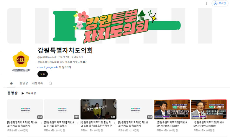 [강원도 세계타임즈=김민석 기자] 강원특별자치도의회(의장 김시성)가 의회의 역할을 알리고, 도민과의 소통을 확대하기 위해 뉴미디어 트렌드를 반영한 유튜브 채널을 8월 28일 개설했다.