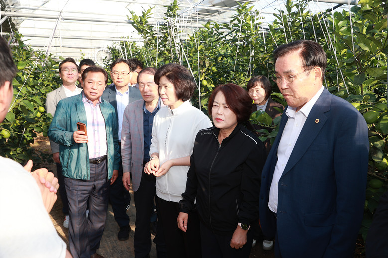 17일(화) 오후 동구 둔산동에 위치한 귤 재배 농가를 방문한 경환위 위원들은 ‘기후변화 대응 아열대 작물 도입 시범사업’을 주관하고 있는 대구시 농업기술센터 오명숙 소장으로부터 시범사업 전반에 대한 현황을 보고 받고, 최근 수확이 한창인 농가를 둘러보며, 지역 기후변화 대응 작물의 성공 가능성을 살폈다.