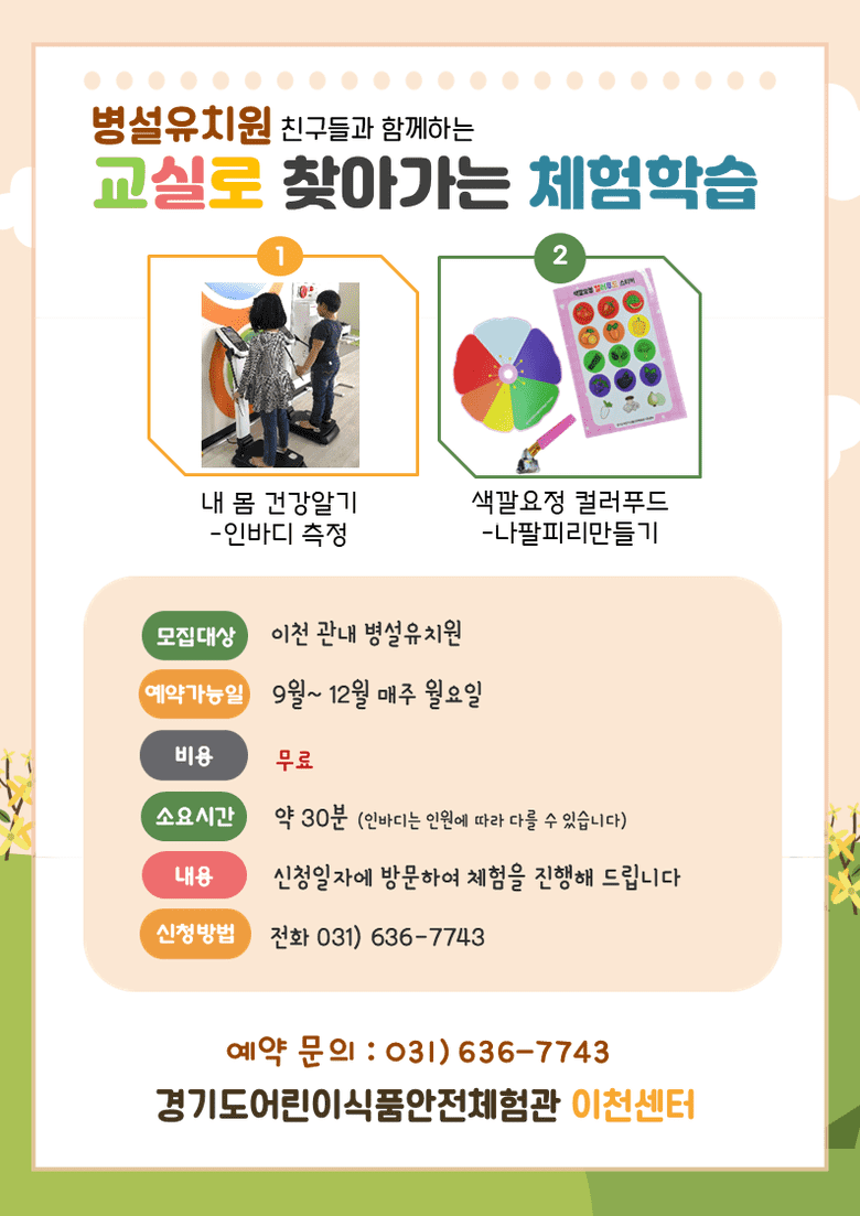 | ▲어린이식품안전체험관 병설유치원 대상 교실로 찾아가는 체험학습 포스터.(사진=이천시) |