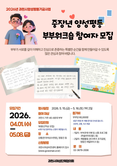 이번 사업은 부부간 소통과 이해를 높이고 서로를 존중하는 관계 형성을 지원하기 위한 것이다. 참여 신청은 과천시여성비전센터 누리집(www.gcwoman.or.kr)을 통해 진행 중이며, 모집 대상은 과천시에 거주하는 40~60대 부부 16쌍이다. 참가비는 부부당 6만 원이며, 기존 참여자는 재참여가 제한된다.