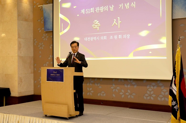 [대전 세계타임즈=이채봉 기자] 대전시의회 조원휘 의장은 31일 선샤인호텔에서 개최된‘제51회 관광의 날 행사’에 참석해 “국토의 중심지로 많은 관광 자원을 가진 대전의 관광산업 진흥을 위해 대전시의회가 앞장서겠다”고 밝혔다. 이날 조원휘 의장은 관광진흥유공 표창 수상자들을 축하하고 지역 관광산업 발전을 위한 관계자들의 노고에 감사를 전했다.