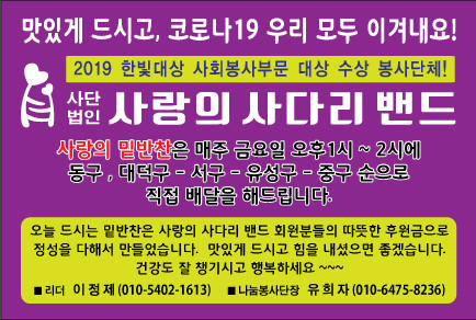 대전시지체장애인협회서구지회 권준석 회장은 “매월 1회 서구지체장애인들을 위하여 맛있는 밑반찬을 6년째 지원해주고 있는 사랑의 사다리 밴드 봉사단체에 감사함을 전한다.”고 말했다.