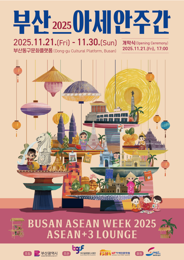 ◈ '아세안플러스쓰리(ASEAN+3) 라운지'를 주제로, 아세안 국가와 관련한 다채로운 전시·체험 프로그램 진행… 아세안 국가 소개, 국가별 등불 전시, 문화 체험 등 [세계타임즈=부산 이용우 기자] 부산시(시장 박형준)는 오늘(21일)부터 11월 30일까지 열흘간 동구 문화플랫폼(도시철도 부산진역 8번 출구)에서 「2025 부산-아세안 주간」을 개최한다고 밝혔다.